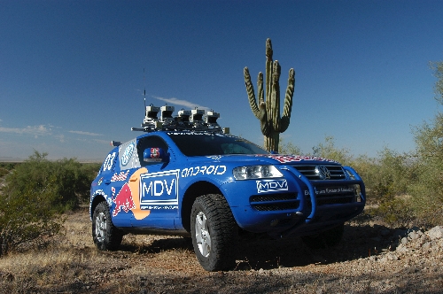 During the 2005 DARPA Grand Challenge, the Stanford team's modified Volkswagen Touareg just beat out two competing GM Humvees built by students and teachers from Carnegie Mellon University. Their total time for the 132-mile route was 6 hours and 54 minutes. The two CMU Humvees came in second and third at just over 7 hours. Tulane University finished fourth with a modified Ford Escape Hybrid sports utility vehicle in 7 hours and 30 minutes.