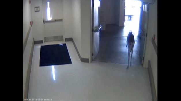 Security camera footage shows the deer entering the hospital quite frantically and running down a hallway.
