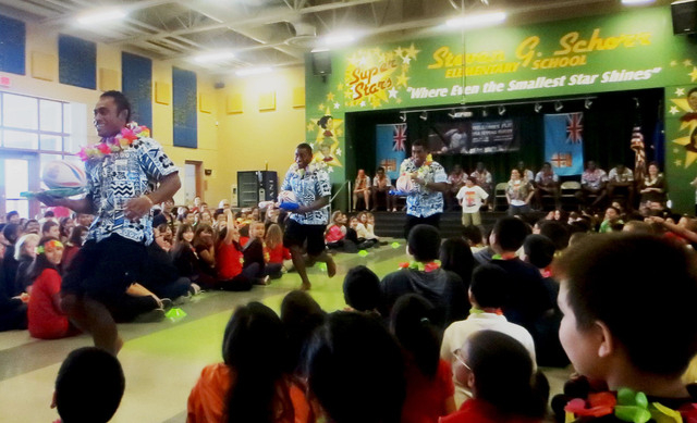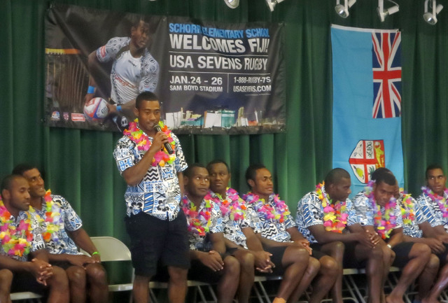 Members of the Fiji national rugby sevens team visited Schorr Elementary School on Jan. 21 for a pep assembly to celebrate the school’s participation in the annual Adopt-A-Country program coordinated by USA Sevens Rugby and the Clark County School District.