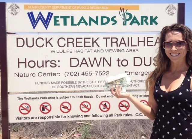 A few minutes after that, at 1:19 p.m., Twitter user Heather Powell tweeted a photo of herself with an envelope of cash standing by the Wetlands Park sign. “Winner winner chicken dinner,” she said.