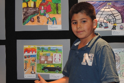 Sunrise Acres Elementary School fifth-grader Fernando Farfan stood in front of his piece, which won second place in the contest. He said his drawing was like a postcard that showed his family's house and car on one panel of and the desert with palm trees, mountains and city buildings on the other.