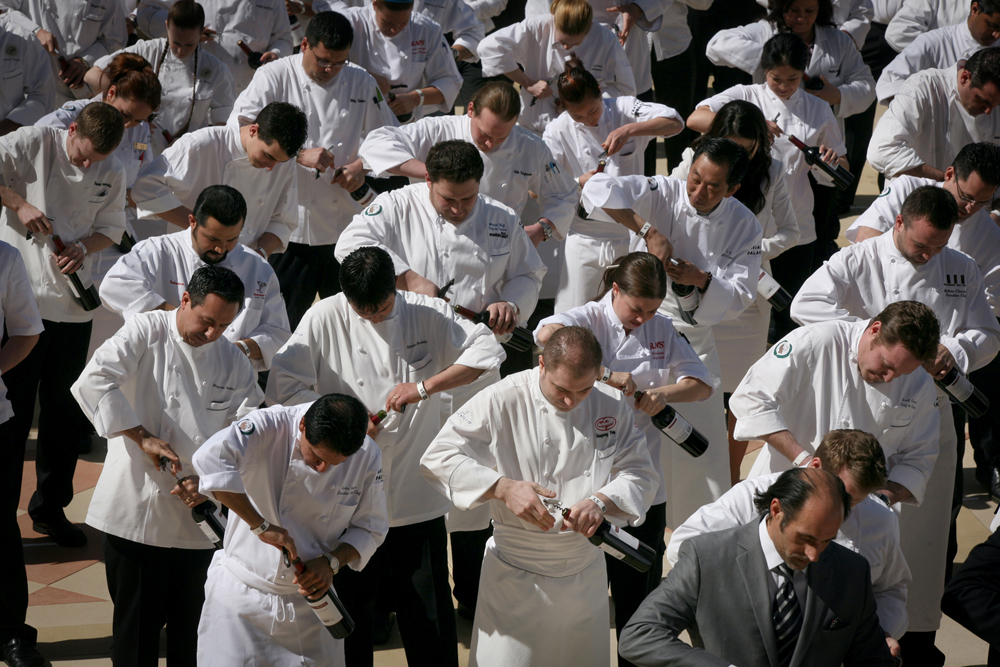 Las Vegas food industry personal gathered at the Bellagio to attempt the Guinness world record for uncorking the most bottles of wine simutaneously on Wednesday, Feb. 29, 2012. The event, which kicked off the 2012 Vegas Uncork'd by Bon Appetit, set a record of opening 308 bottles of wine in 30 seconds.