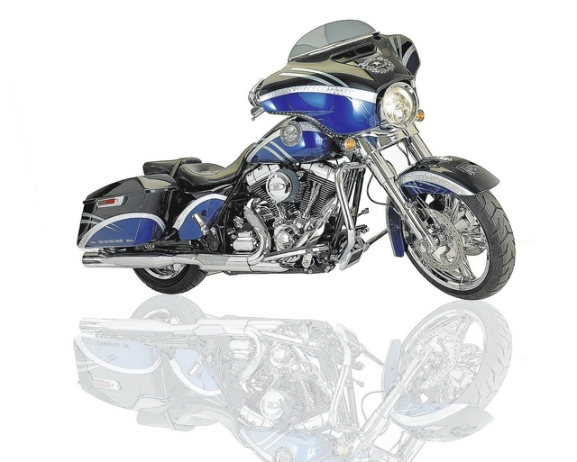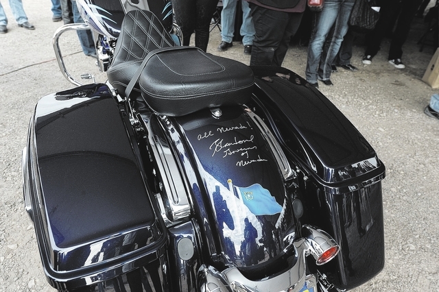 The bike, a 2014 FLHX Harley-Davidson Street Glide, was signed by Nevada Gov. Brian Sandoval. It was built from the ground up and features a custom two-tone Nevada blue paint job highlighted by the Battle Born Nevada 150th logo, the state seal and state flag. The motorcycle also features upgraded stereo and speakers and a heavy breather kit and mufflers for extra horsepower and sound.