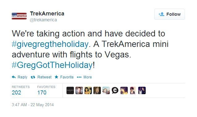 “We’re taking action and have decided to #givegregtheholiday. A TrekAmerica mini adventure with flights to Vegas. #GregGotTheHoliday!” the London-based travel company tweeted.