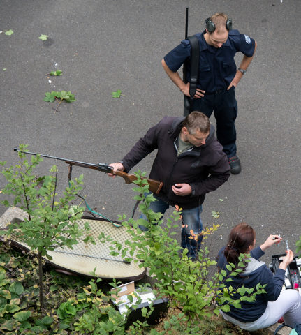 Marko Laske says officers and wildlife spent six hours trying to shoo the moose into a container but eventually had to resort to using a tranquilizer gun after he refused to follow orders.