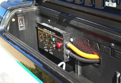 Another innovative feature of the Ram 1500 PHEV battery pack is that it can provide external power generation. Not only can the battery pack be used to drive a dual electric-motor system to supplement the main 5.7-liter Hemi V-8 engine, it also can serve as an auxiliary mobile power source for tools, instruments or electronic equipment through an externally mounted power panel.