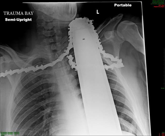 Valentine had emergency surgery at Allegheny General Hospital. Doctors say the saw missed major arteries and instead cut into muscle. The hospital Tuesday released an X-ray showing the saw still in the 21-year-old’s neck.