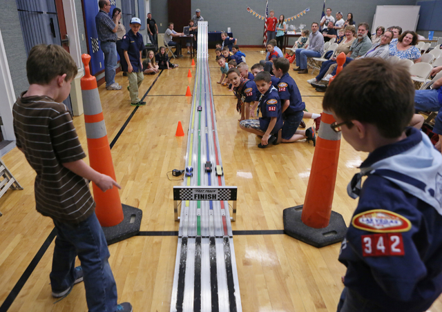 Inside the crowded auditorium at The Church of Jesus Christ of Latter-day Saints in Henderson, 15 Cub Scouts and their families from Troop 342 gather around northwest resident Brent Bulloch. They talk excitedly as they prepare to race their cars in the annual Pinewood Derby race.