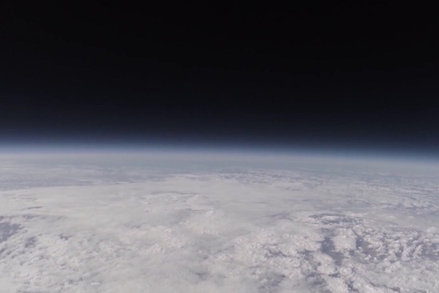 After a few minutes of enjoying the scenery (and the strangely motivational music in the background) the balloon pops, and the camera begins its descent back to Earth. You can even see the falling remains of the balloon.