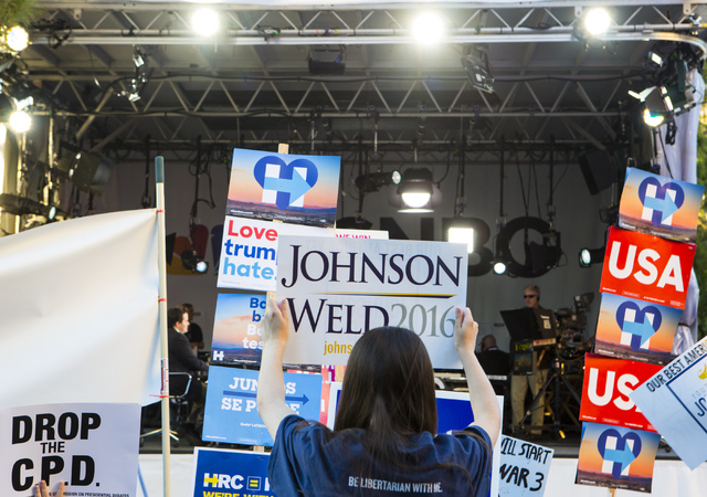 A supporter of Libertarian presidential candidate Gary Johnson holds up a sign in front of the MSNBC stage ahead of the third presidential debate at UNLV in Las Vegas, on Wednesday, Oct. 19, 2016. Miranda Alam/Las Vegas Review-Journal Follow @miranda_alam