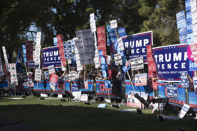 A woman in support of Republican presidential candidate Donald Trump stands in front of the CNN stage ahead of the third presidential debate at UNLV in Las Vegas, on Wednesday, Oct. 19, 2016. Miranda Alam/Las Vegas Review-Journal Follow @miranda_alam