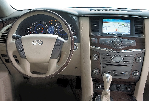 Entering the QX's inner sanctum with pink slip in hand will leave you with little change from your $60,000 check, or leave you owing more if you attack the lengthy option sheet a bit too enthusiastically. However, a burbling V-8, the smell and feel of perforated cow hide engulfing your posterior and the too-numerous bells and whistles could ultimately win you over to the QX56 way of living large.