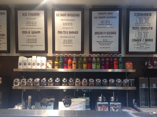 Ice cream sandwiches feature fresh baked cookies ($2.25), and the menu also has malts and shakes ($2.75 to $5.25) and ice cream sundaes ($4.75 to $5.75) made with homemade whipped cream and a cherry.