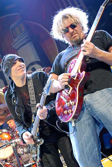 Former Van Halen bassist Michael Anthony, joining singer Sammy Hagar was on stage Saturday at The Pearl (Palms)for a three-song encore with guitarist Joe Satriani and Red Hot Chili Peppers drummer Chad Smith. While walking off stage, Hagar stopped to autograph an actual 55 mph road sign that was carried in by a fan of Hagar’s hit, “I Can’t Drive 55.” In the crowd: Music group Alizma, which features three blonde triplets who play electric violins. Hagar and Smith were spotted dining with separate parties at N9NE steakhouse (Palms) following the concert.