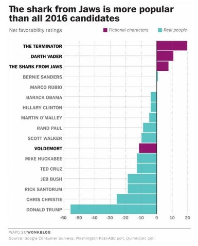 The 2016 presidential candidates — particularly of the Republican variety — have some terrifying competition: The shark from the classic horror film “Jaws” has a higher favorability rating than any of the current bunch, according to a new poll.