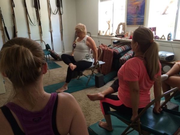 The chair exercises were followed by stretches on the floor, using straps in a buddy system before going into traditional yoga poses.
