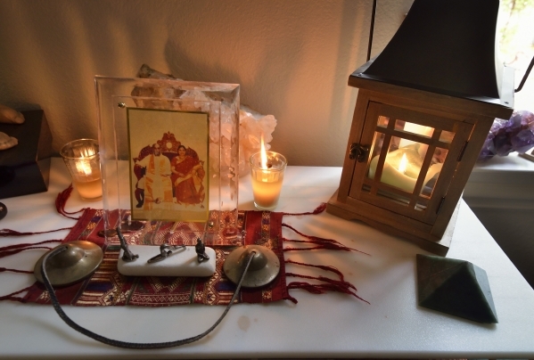 Yoga involves concentration. To help clear the mind, the studio is filled with soft sitar music, scented candles, sculptures of yoga poses and a Buddha statue.