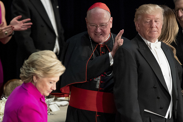 Trump and Clinton sat one seat apart for the evening, with New York’s Cardinal Timothy Dolan acting as the only buffer. And when they entered and took their seats, they did not greet each other or make eye contact, though they did shake hands at the conclusion of the roast.