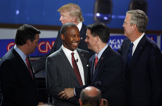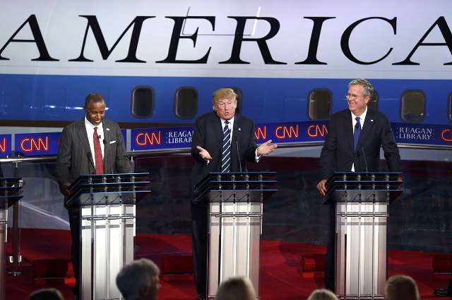 Also debating in the main event at the Ronald Reagan Presidential Library in Simi Valley were Scott Walker, Ted Cruz, Marco Rubio, Mike Huckabee, John Kasich and Chris Christie.