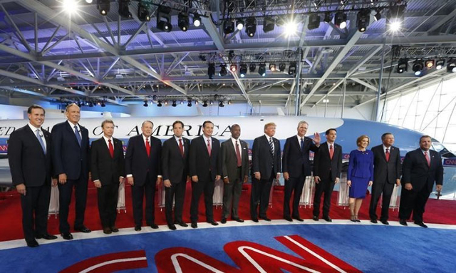 With Trump shooting to a big lead in opinion polls in the Republican presidential race, the other 10 candidates on the crowded debate stage struggled at times for attention barely four months before the first nominating contest for the November 2016 election.