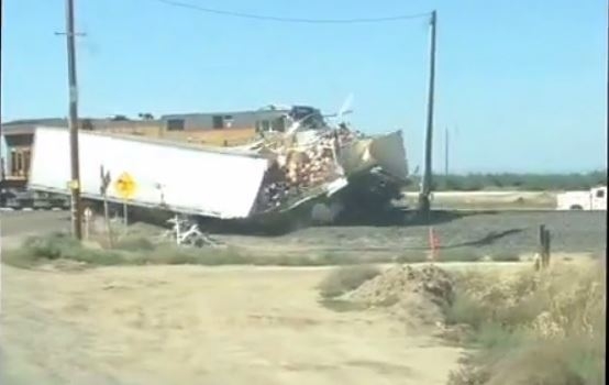 Video shows train plowing through semi-truck stuck on tracks