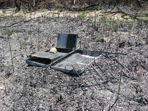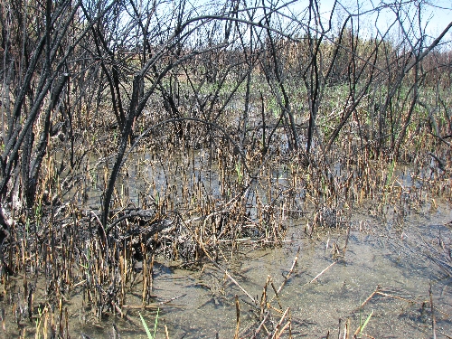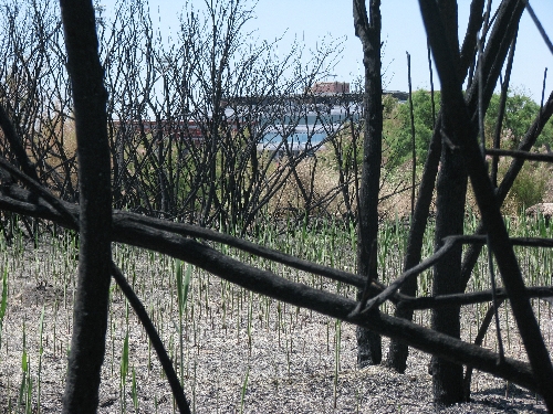 It took three days to completely douse the fire that began on April 16. Only two weeks later, nature is reclaiming the damaged area. Two-foot shoots are growing out of inches of ash, and wildlife can be seen fluttering among the burnt branches and heard rustling though the remaining rushes on the edge of the devastation.