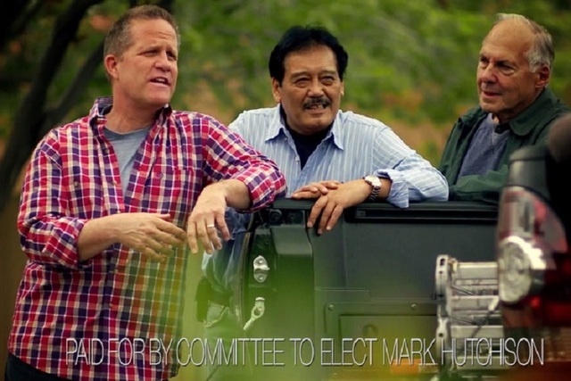 The ad also notes Hutchison fought for more education funding, and that he stood with Gov. Brian Sandoval (who handpicked him for the race, and is seen in the ad having a nice walk-and-chat with Hutchison) in adding $486 million to education “without raising taxes.”