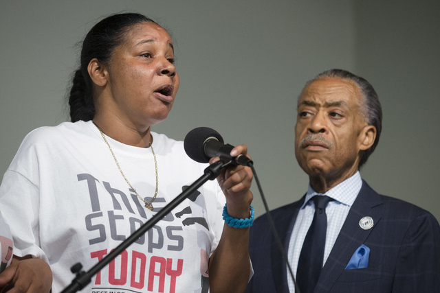 The widow and other members of Garner’s family spoke at the Harlem headquarters of the Rev. Al Sharpton. On Friday, Sharpton and the family met with federal prosecutors to ask them to bring a civil rights case against the New York Police Department officers who stopped Garner on Staten Island on suspicion of selling untaxed cigarettes.