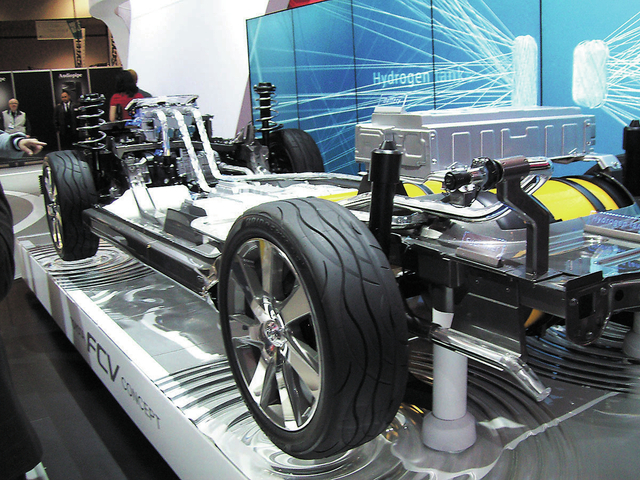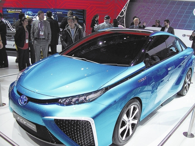 The fuel cell creates electricity to drive its electric motor and forms water vapor at its exhaust pipe. With a range of 300 miles, a top speed of 105 mph and the torque of an electric motor drive train, this platform can usher in another automotive technology revolution. Toyota executives acknowledged a lack of hydrogen refueling station infrastructure worldwide, but are looking to California as its initial U.S. marketplace, where that state is already installing hydrogen stations at key locations.